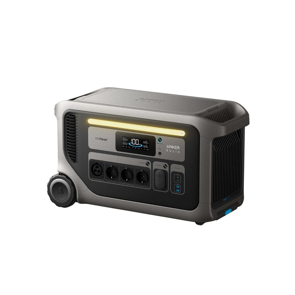 Anker SOLIX F3000 Powerstation mit 3.072 Wh Speicher und 3.600 W Dauerleistung in zentraler Frontansicht Anker SOLIX F3000 Powerstation mit 3.072 Wh Speicher und 3.600 W Dauerleistung Anschlussseite der Anker SOLIX F3000 Powerstation mit AC-Steckdosen, Display und Bedienelementen Anker SOLIX F3000 tragbare Powerstation in Schrägansicht mit Transportrollen und stabilem Gehäuse Rückseite der Anker SOLIX F3000 Powerstation mit integrierter Belüftung für thermisch stabilen Betrieb Seitenprofil der Anker SOLIX F3000 Powerstation mit kompaktem Aufbau und rollbarem Design