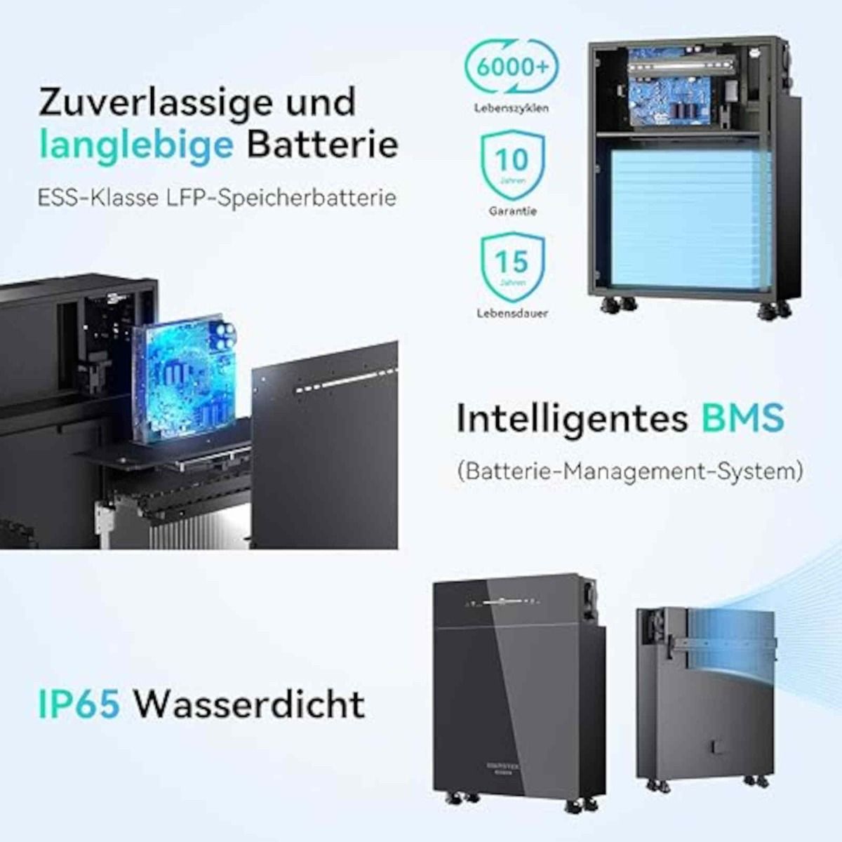 Die Batterie nutzt LiFePO4‑Technologie und ist ausgelegt für mehr als 6 000 Lade‑/Entladezyklen bei 25 °C, was eine Nutzungsdauer von mehreren Jahren auch bei regelmäßigem Einsatz ermöglicht.