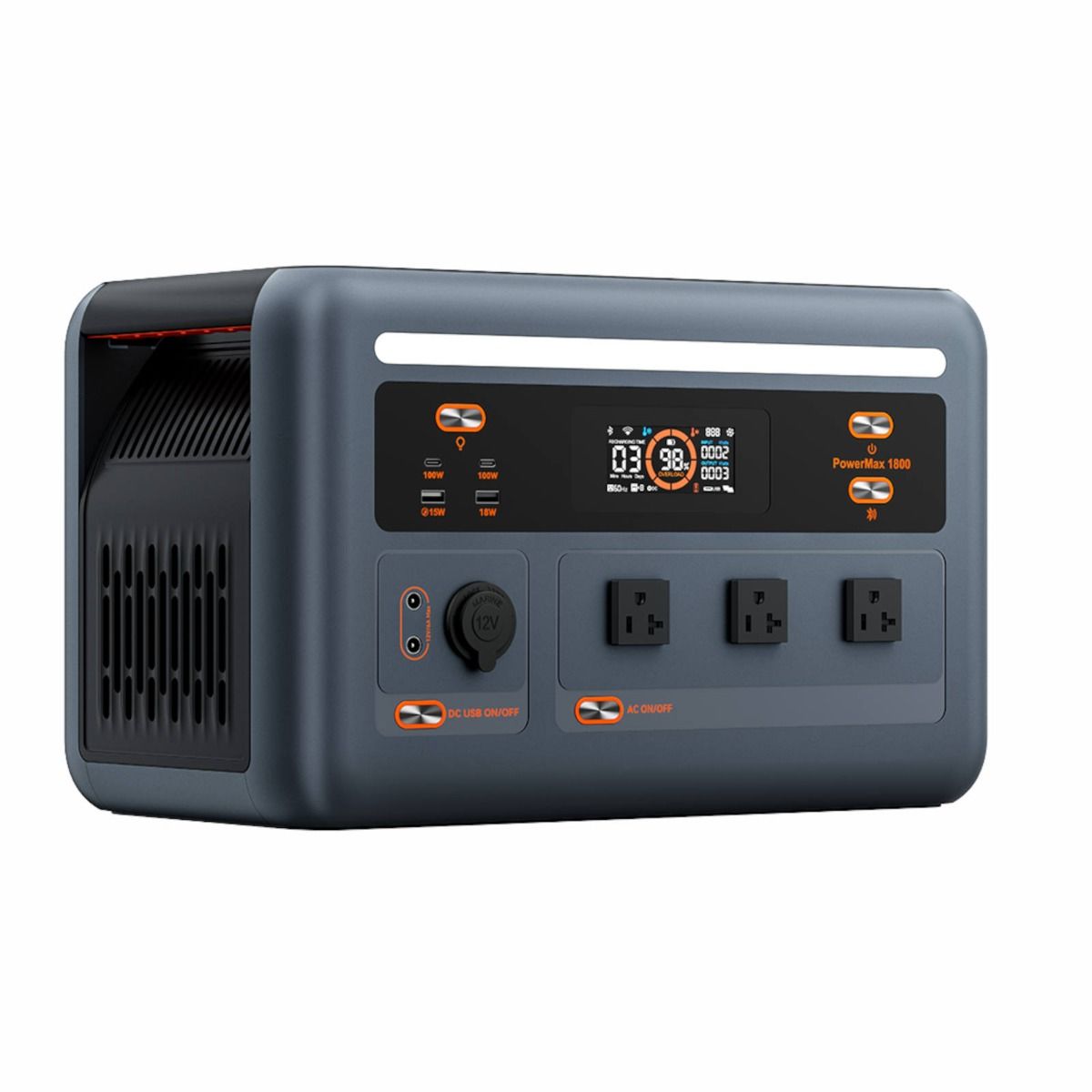 Oscal PowerMax 1800 tragbare Power Station in Frontansicht mit Display, AC-Steckdosen, USB-Ports und 12-V-Anschluss