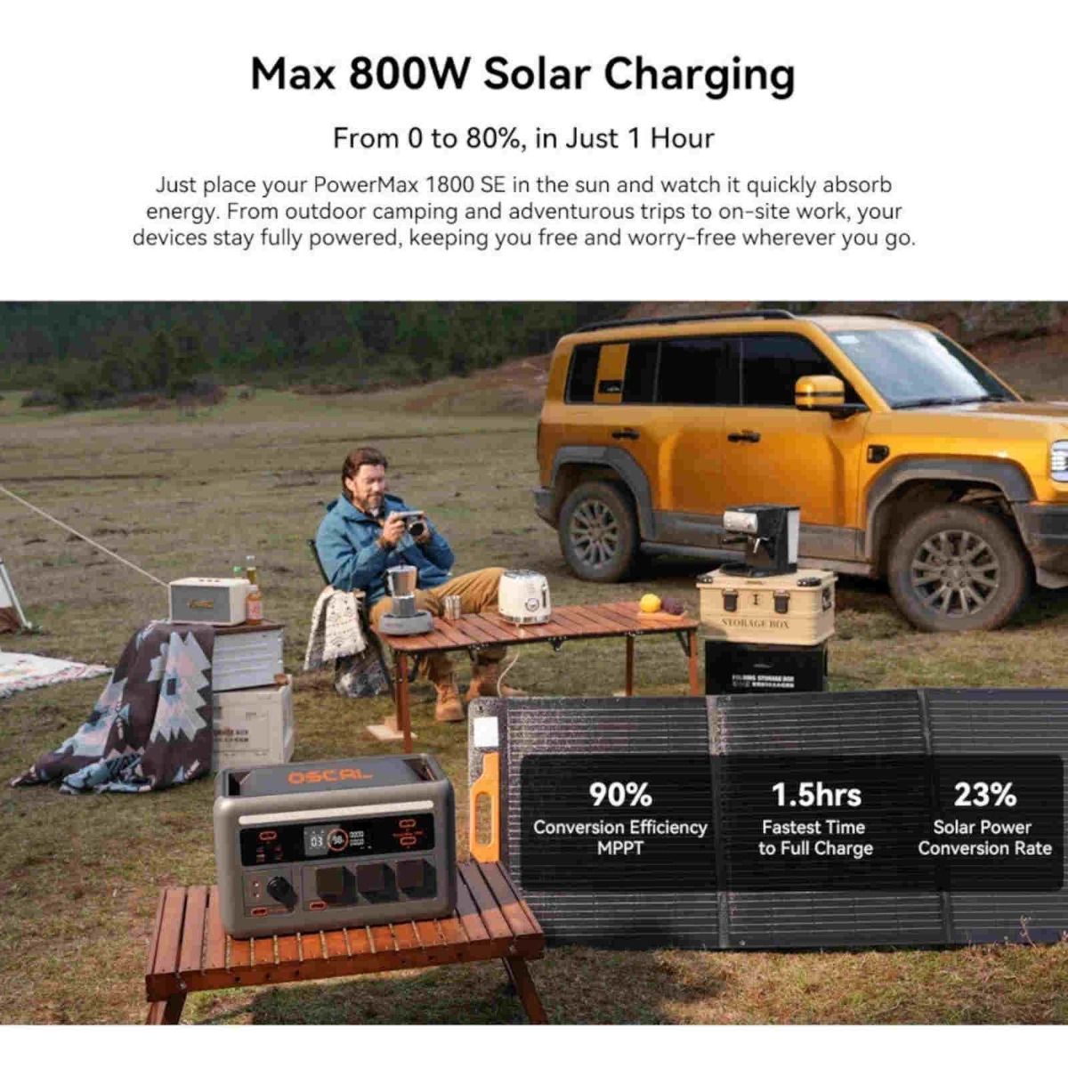 OSCAL PowerMax 1800SE tragbare Powerstation mit Display, USB-C-, USB-A-Anschlüssen und drei AC-Steckdosen, Frontansicht OSCAL PowerMax 1800SE tragbare Powerstation mit Display, USB-C-, USB-A-Anschlüssen OSCAL PowerMax 1800SE Powerstation mit 1024Wh Kapazität im Wohnmobil beim Camping zur Stromversorgung von Kaffeemaschine und Geräten OSCAL PowerMax 1800SE Powerstation mit zehn Output-Ports zur Versorgung von Laptop, Kamera, Ventilator und Haushaltsgeräten OSCAL PowerMax 1800SE Powerstation mit Solarpanel beim Outdoor-Camping, unterstützt Solarladung bis 800W OSCAL PowerMax 1800SE tragbare Powerstation mit verschiedenen Ladeoptionen wie AC-Netzladung, Fahrzeugladung und Solarladung
